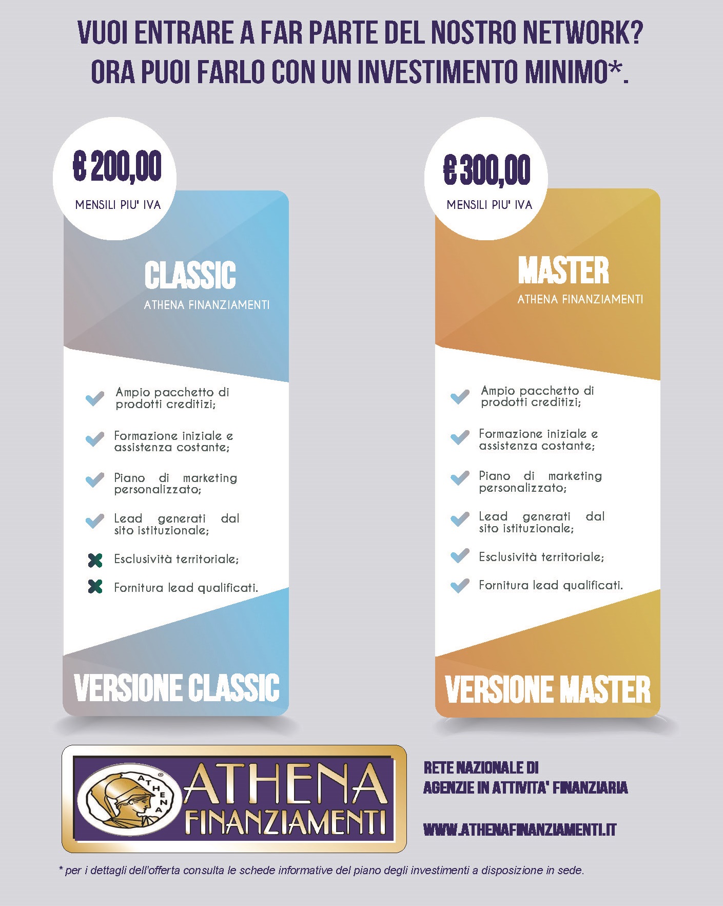 Ti ricordiamo che le informazioni dettagliate sul nuovo progetto agenziale di Athena Finanziamenti, che ha adeguatamente recepito le modifiche normative del settore, come da art. 128-quater del D.Lgs 13/08/2010, n. 141, sono reperibili cliccando qui.